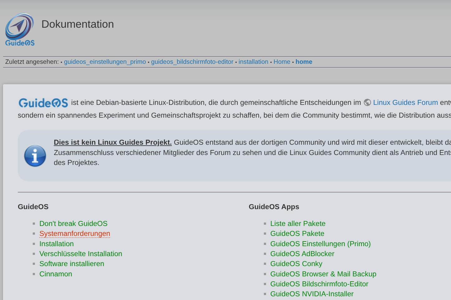 Es wird in der Wiki Informationen zur Installation von GuideOS geben. Aber auch die Apps, die wir selbst oder in der Community erstellt wurden, werden hier genauer beschrieben. Damit habt ihr neben unserer Homepage und dem Linux Guides Forum mit der Wiki noch eine 3. Quelle wenn es um Lösungen geht.